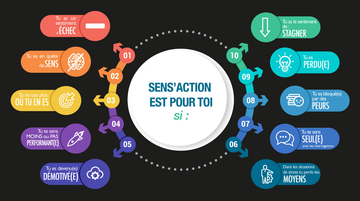 Sens’ACTion s’adresse aussi à celles et à ceux qui vivent un creux dans leur carrière ou une mauvaise passe. Face à la frustration on peut vivre une perte de sens. Se lever le matin ou même se remobiliser devient difficile. Ces situations sont d’autant plus compliquées à gérer qu’elles ont souvent un impact social et familial important. Nous travaillerons à identifier ensemble, grâce à plusieurs outils la direction à prendre et comment la prendre.